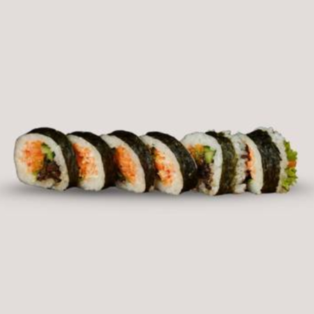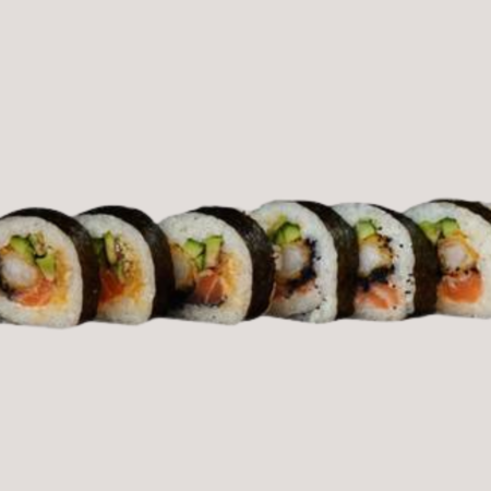 Salmon, avocado, cucumber, lettuce, tempura crumbs and spicy mayonnaise rolled with rice and nori sheetAdd to cart €7.65