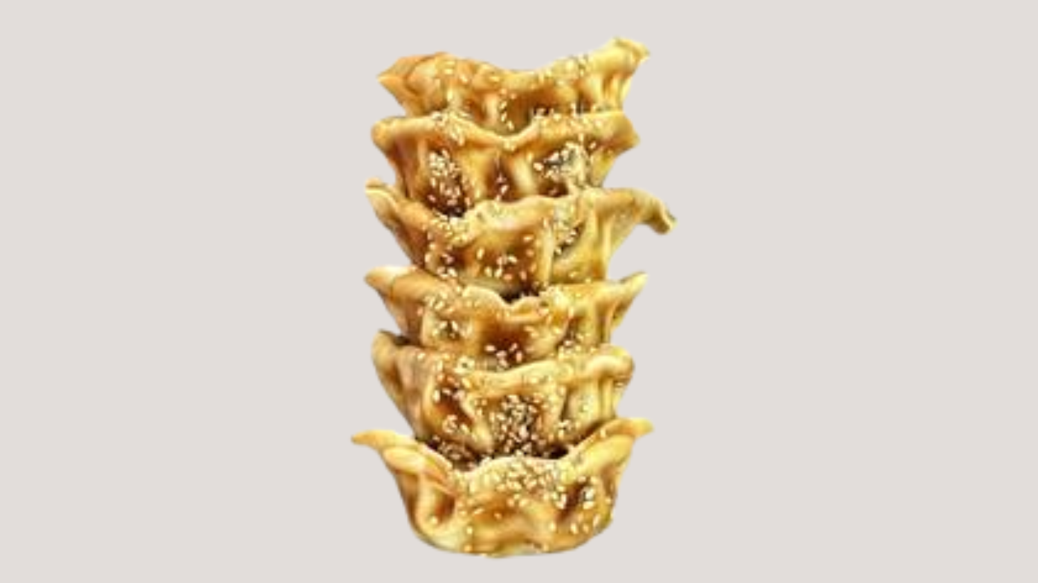 Chicken gyoza topped with bbq sauce and white sesame seeds.