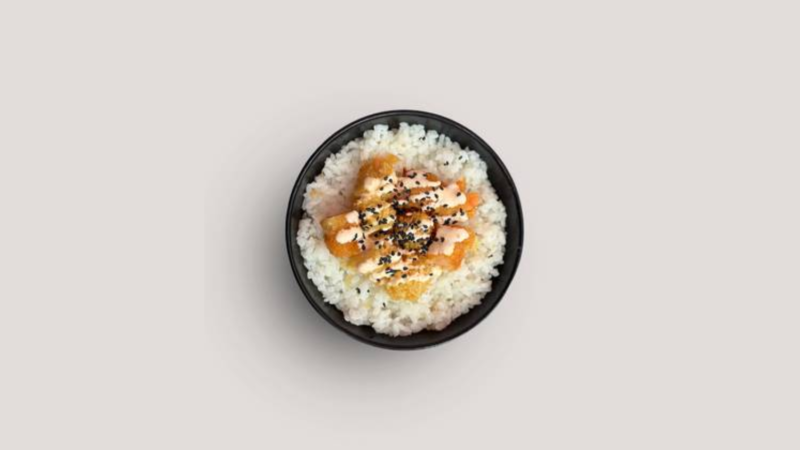 Sushi rice base topped with tempura prawn, spicy mayonnaise, and black sesame seeds.