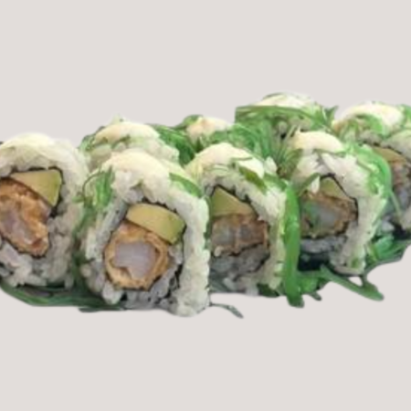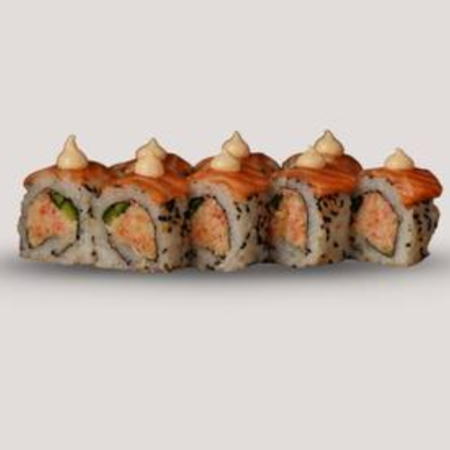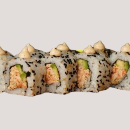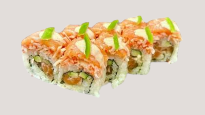 salmon, cucumber, spicy mayonnaise topped with , crab mix(crab stick, red massage, spicy mayonnaise), salmon, bell pepper, and spicy mayonnaise.