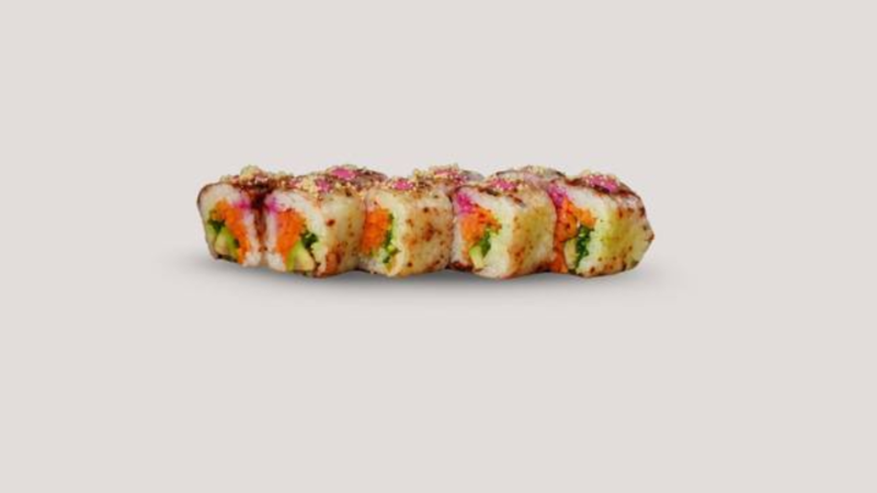 Wakame, avocado, beetroot mayonnaise, carrot topped with beetroot mayo and beetroot f lakes