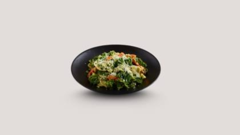 Kale, lettuce, cubed salmon, edamame beans, mixed sesame seeds.