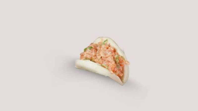 Salmon, spicy mayonnaise, spring onions, avocado, black and white sesame seeds in a bao bun