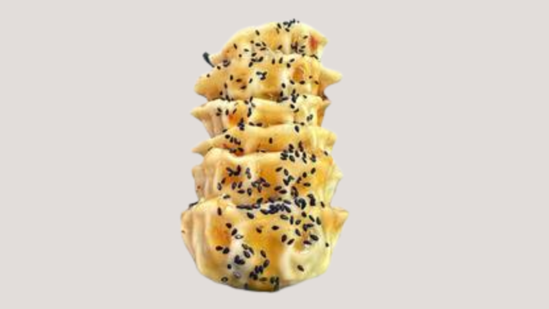 Chicken gyoza topped with sweet chilli sauce and black sesame seeds.
