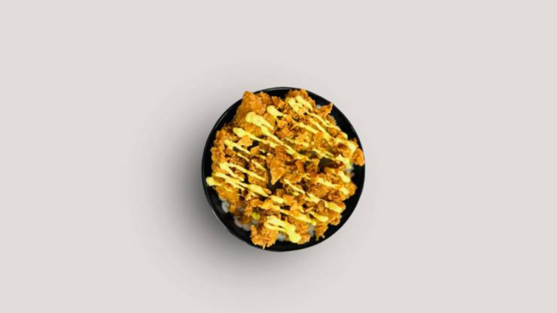 sushi rice base topped with fried chicken pieces, curry mayonnaise, and pappad crumbs.